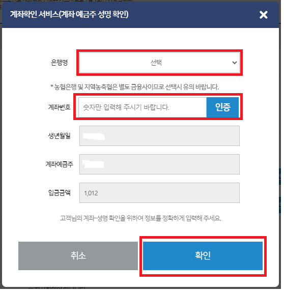 4. 현금으로 받을 은행명과 계좌번호를 입력한 후 계좌 인증을 합니다. 인증을 완료하면 하단부 확인을 클릭합니다.