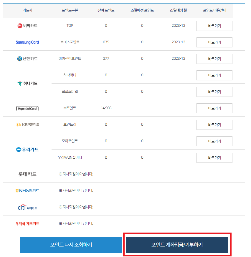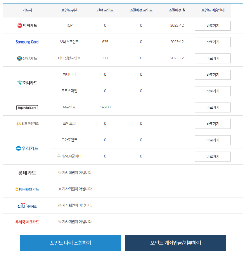 8. 카드사별 ‘잔여 포인트‘와 ‘소멸예정 포인트‘를 확인합니다.