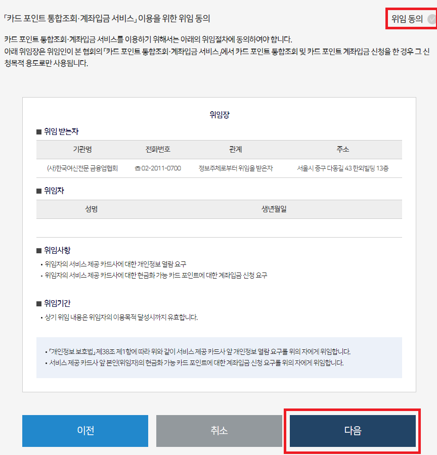 6. 카드포인트 통합조회 서비스 이용 ‘위임 동의‘ 체크 후 ‘다음’을 클릭합니다.