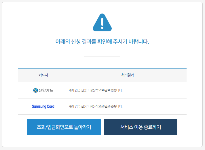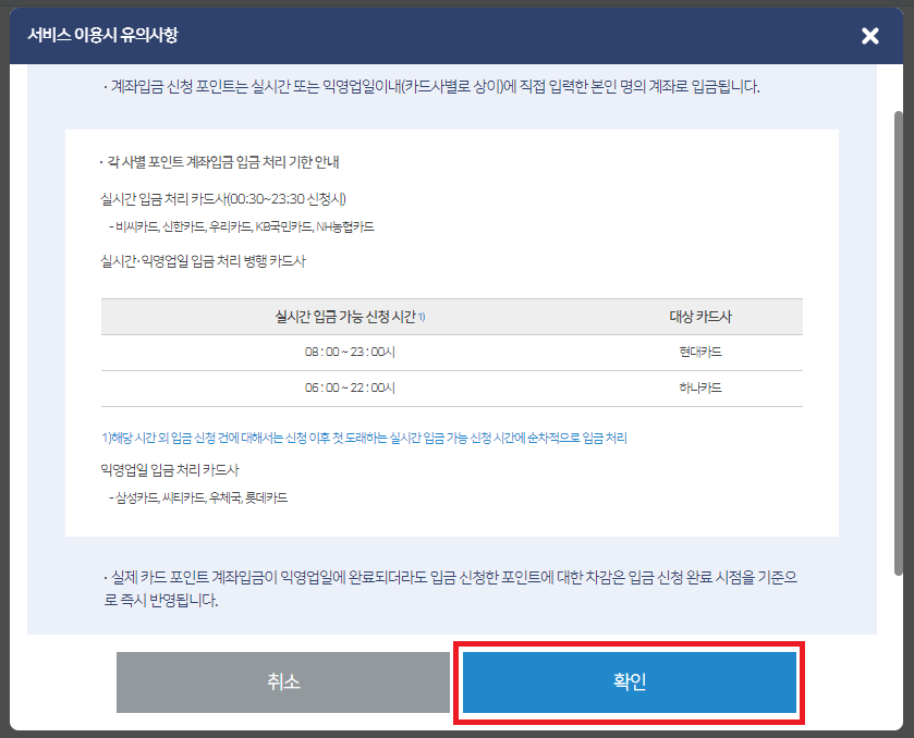 (※ 계좌입금은 당일 바로 입금되는 은행과 익일 입금되는 은행이 있으니 ‘서비스 이용 시 유의사항’을 참고하시길 바랍니다.)