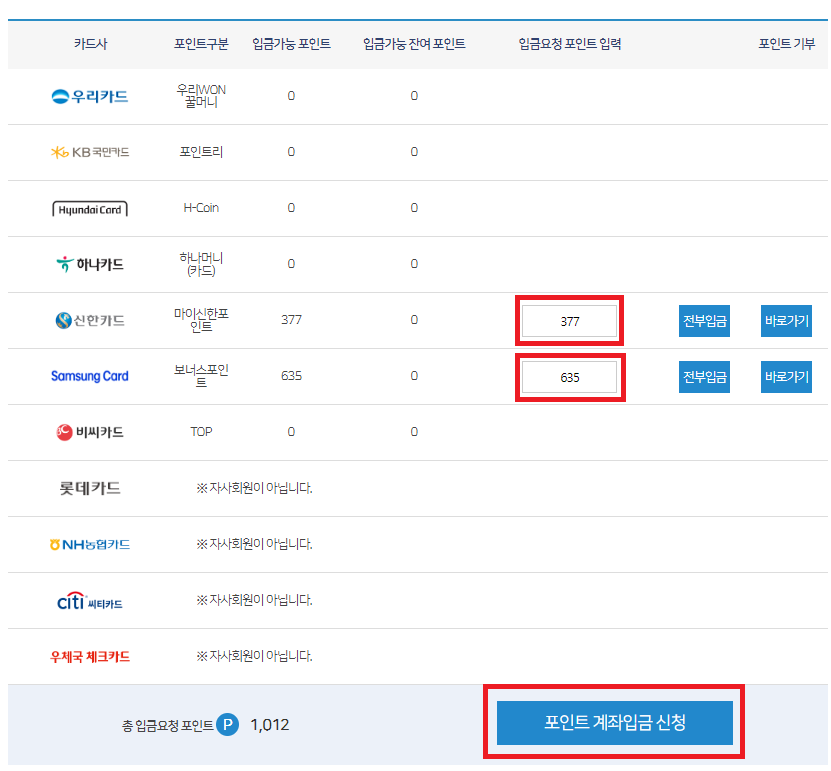 2. 입금가능 포인트를 확인한 후 ‘입금요청 포인트를 입력‘하고 하단부 ‘포인트 계좌입금 신청‘을 클릭합니다.
