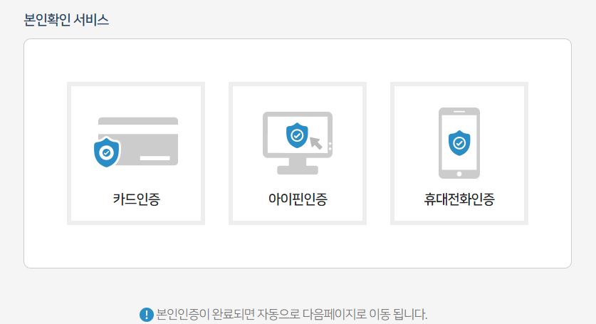 5. 본인확인 인증을 합니다. 카드인증, 아이핀인증, 휴대전화인증 셋 중 하나로 인증을 완료합니다.